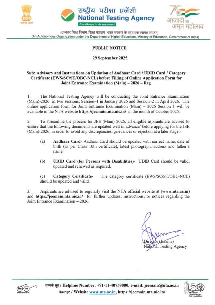 Advisory and Instructions on Updation of Aadhaar Card/ UDID Card/ Category Certificate (EWS/SC/ST/OBC-NCL) before Filling of Online Application Form for Joint Entrance Examination (Main) - 2026 - Reg.